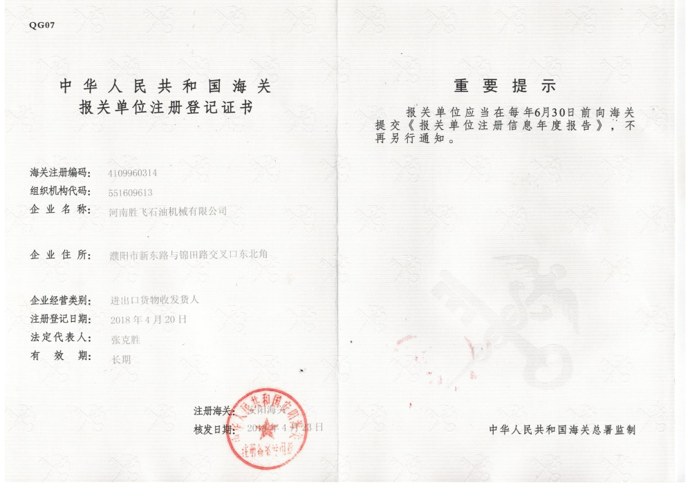 • 海關報關單位注冊登記證書
